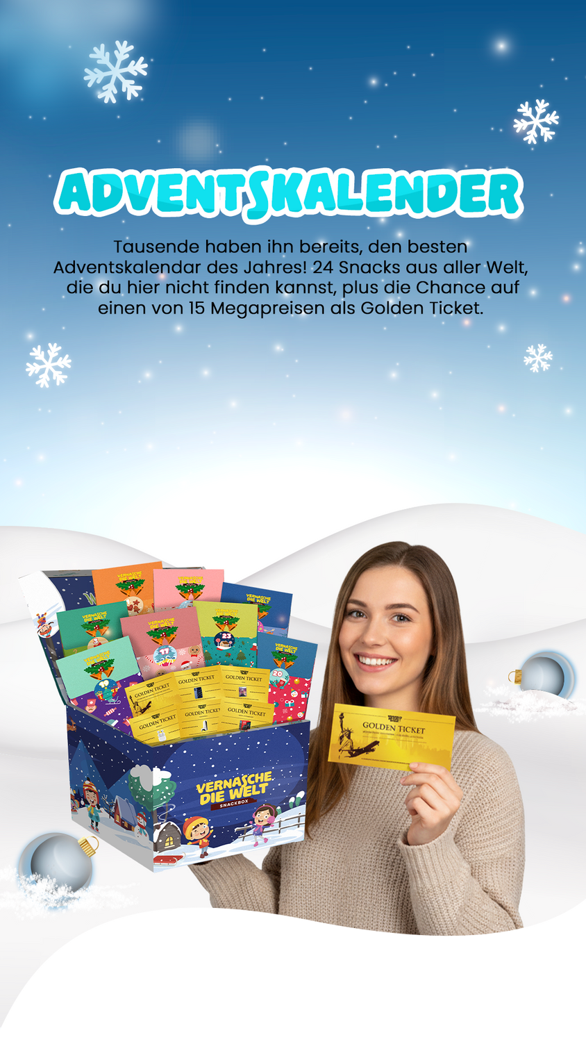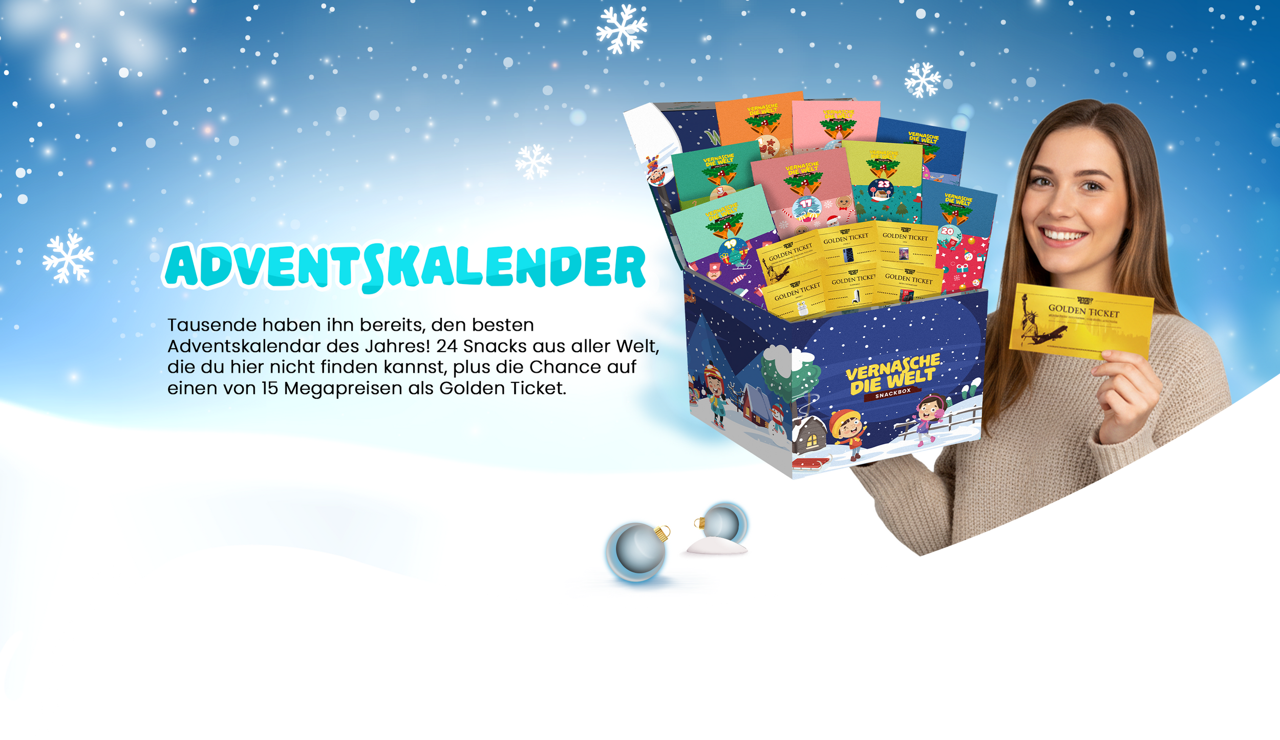 Der geilste Kalender des Jahres mit den coolsten Snacks aus aller Welt. Spannender kann das Türchenöffnen nicht sein! Und am 24.12. vielleicht eines von 15 Golden Tickets finden. Sicher dir jetzt den besten Adventskalender!